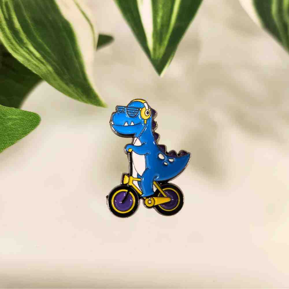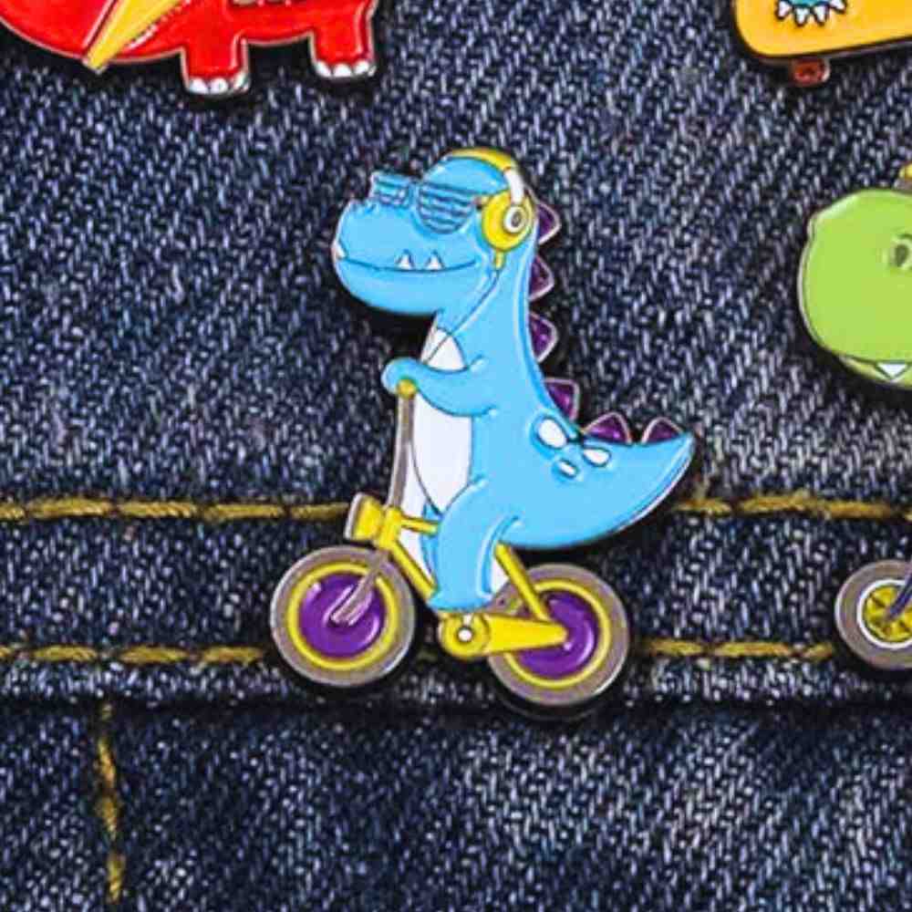 - The combination of a bright blue dino, purple bike wheels, and yellow details makes this pin pop with personality.