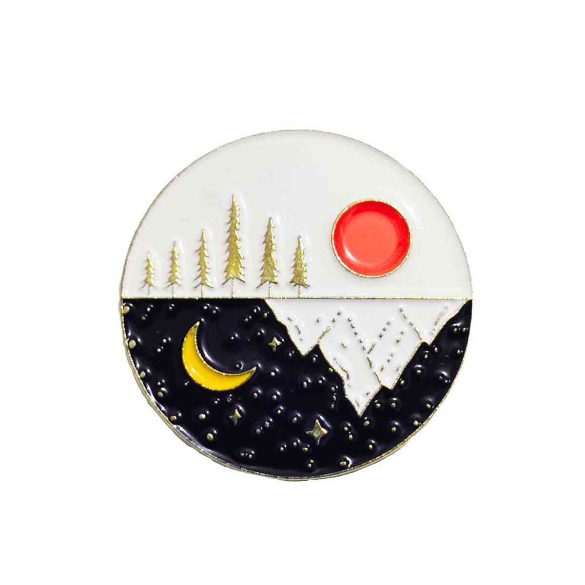 - A stunning half-day, half-night design with a glossy soft enamel finish that brings out the bright yellow crescent moon, fiery red sun, and the intricate mountain and forest details.