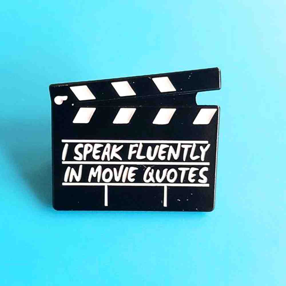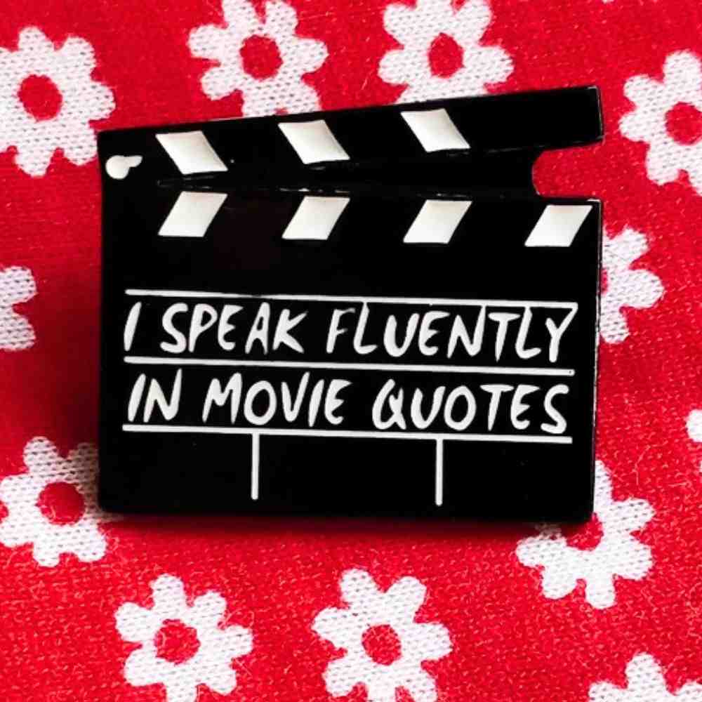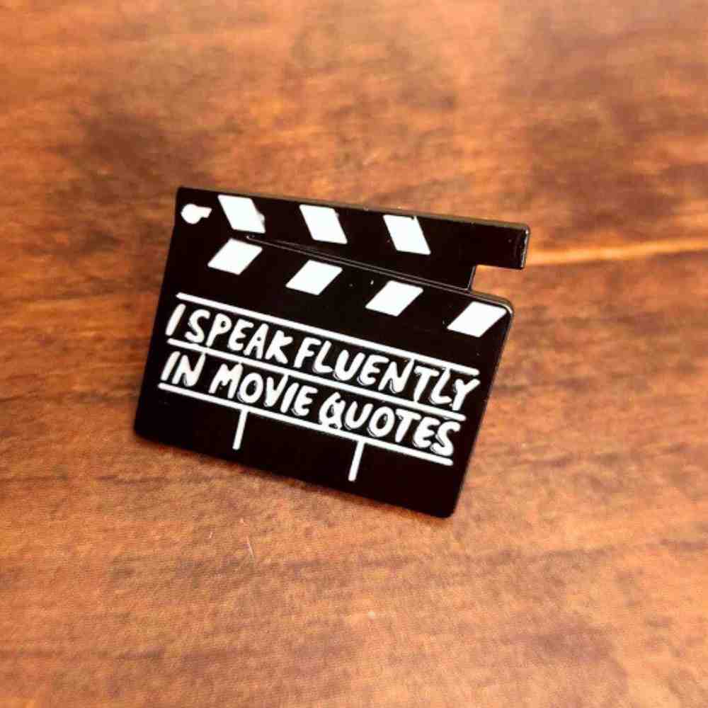 Shaped like a classic Hollywood clapperboard, this pin proudly declares, “I Speak Fluently in Movie Quotes”—a badge of honor for every film buff. Whether you’re channeling your inner Tarantino or Spielberg, this pin screams cinematic passion.