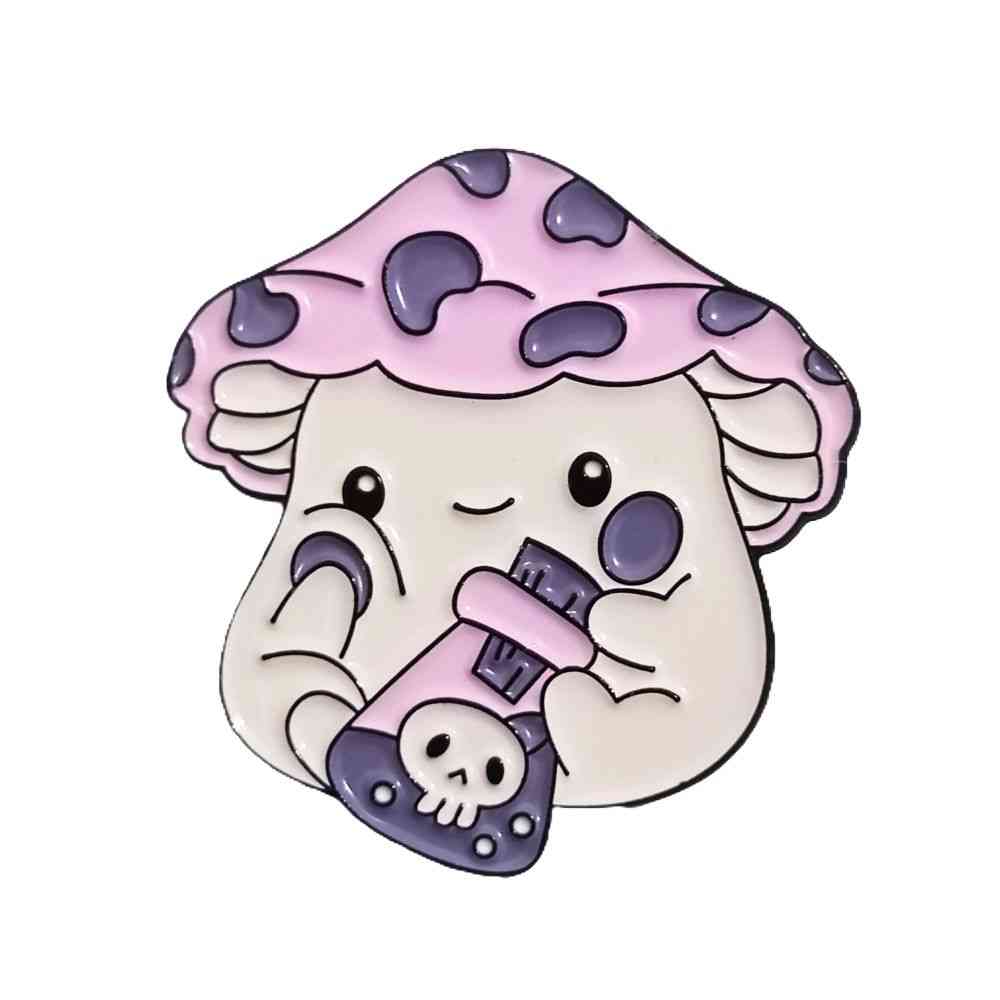 - Design: A smiling pastel pink and purple mushroom with a potion bottle featuring a skull—dangerously adorable.