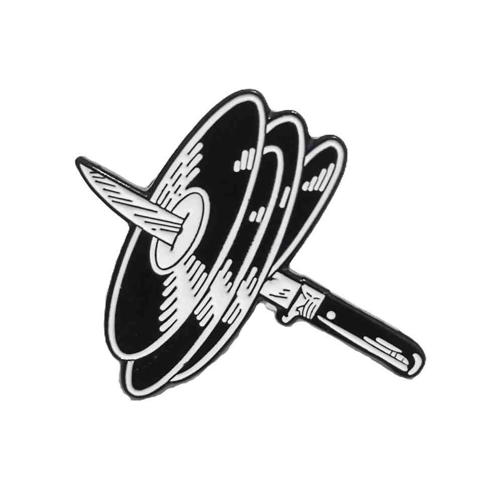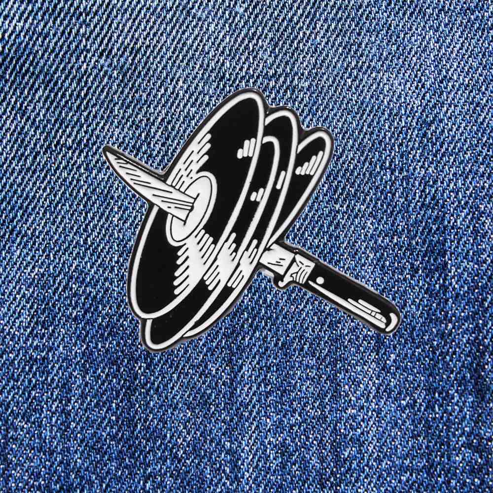 Crafted with a smooth, textured soft enamel finish, this pin boasts intricate details of spinning records layered in a bold black-and-white aesthetic. The blade adds a slick, rebellious touch, making this pin a show-stopper.