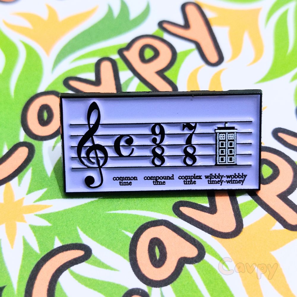 This pin’s “Wibbly-Wobbly Timey-Wimey” reference is a nod to a famous line about time travel from Doctor Who, but with a clever twist on musical time signatures. So, whether you’re in “common time” or feeling “complex,” this pin has you covered!