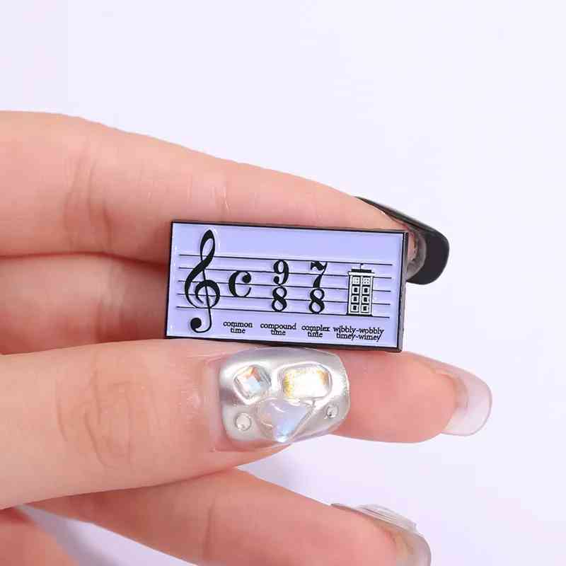 The writings and symbols on the enamel pin cleverly combine musical time signatures with a playful reference to time travel, likely inspired by Doctor Who.